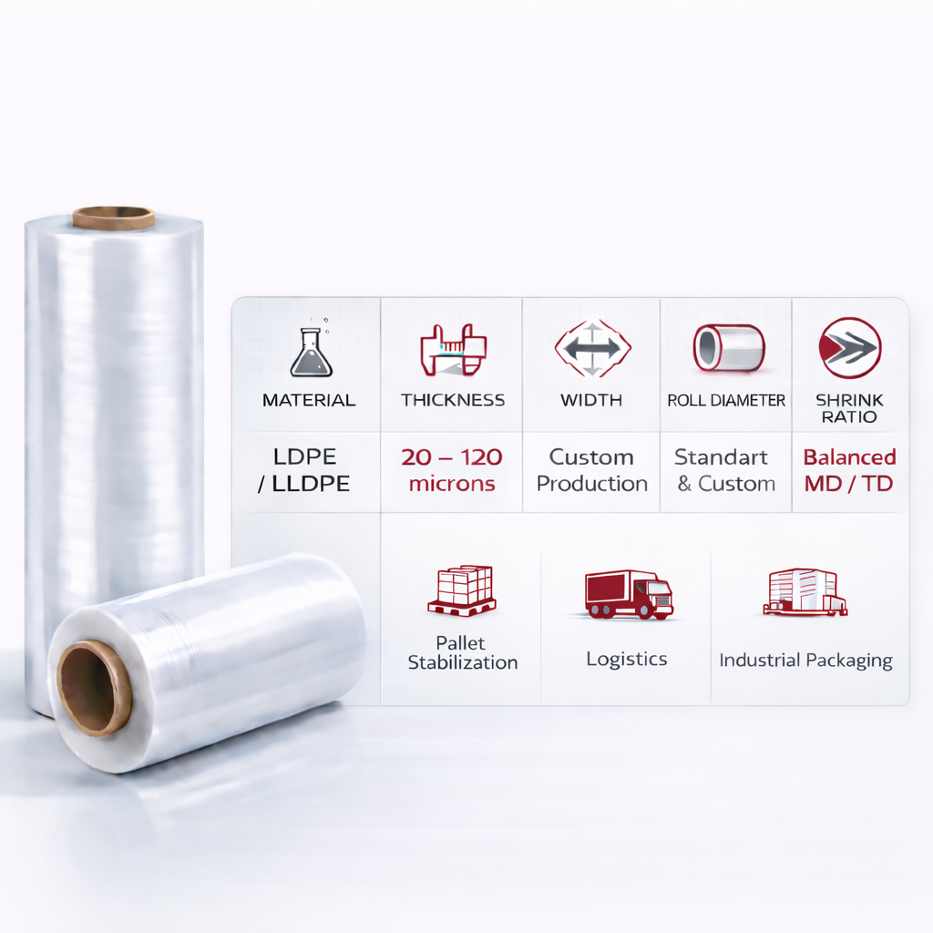 Endüstriyel ambalaj süreçlerinde maksimum yük stabilitesi ve güvenli koruma sağlamak üzere tasarlanmış yüksek performanslı polietilen bazlı film çözümü.